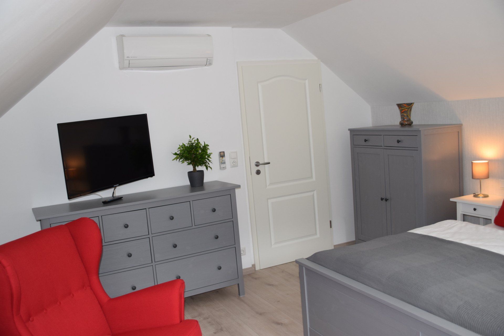 The cozy bedroom in a modern gray-blue tone under the roof is a retreat during the day,