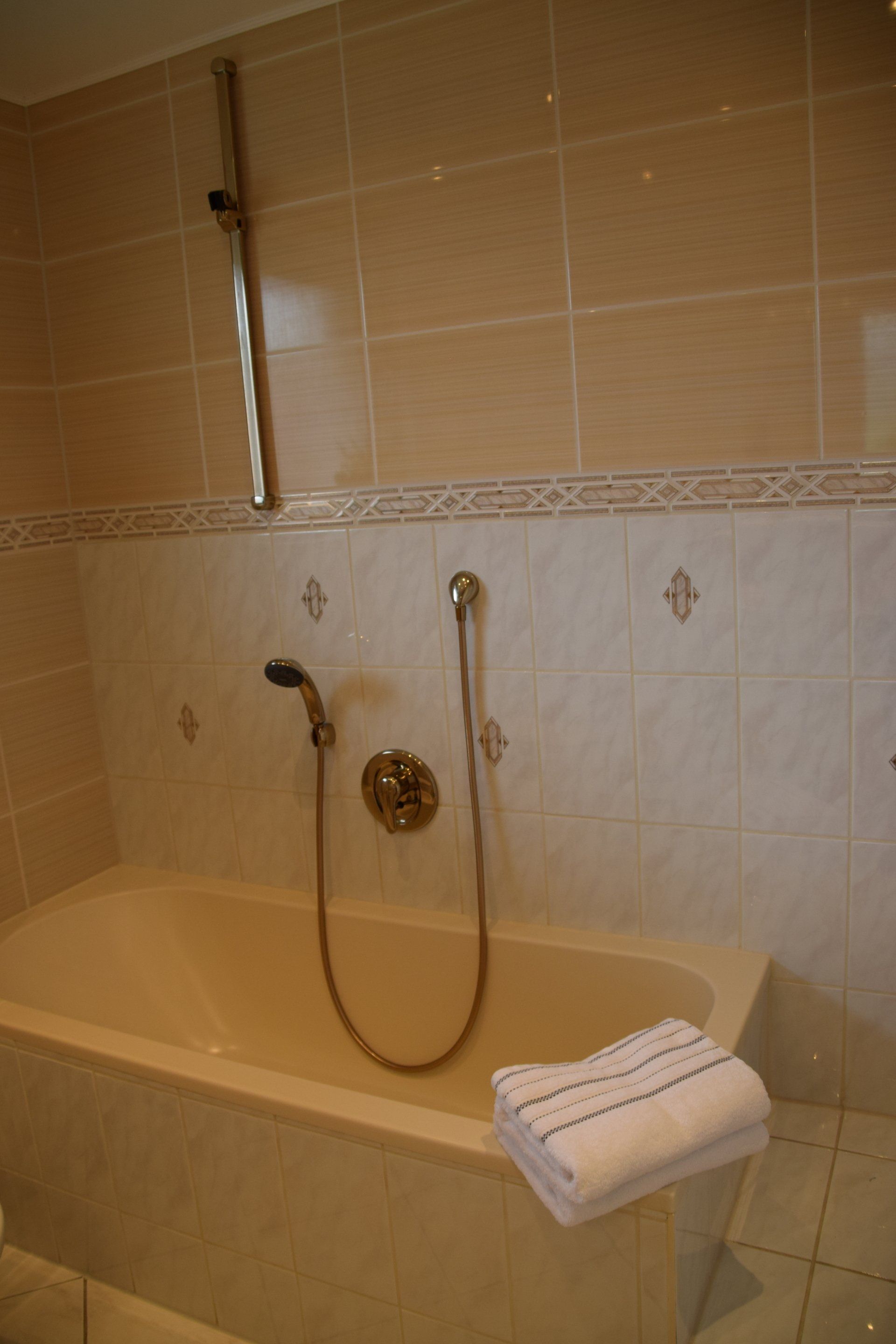 Ein Badezimmer mit Badewannen/-Dusch-Kombination